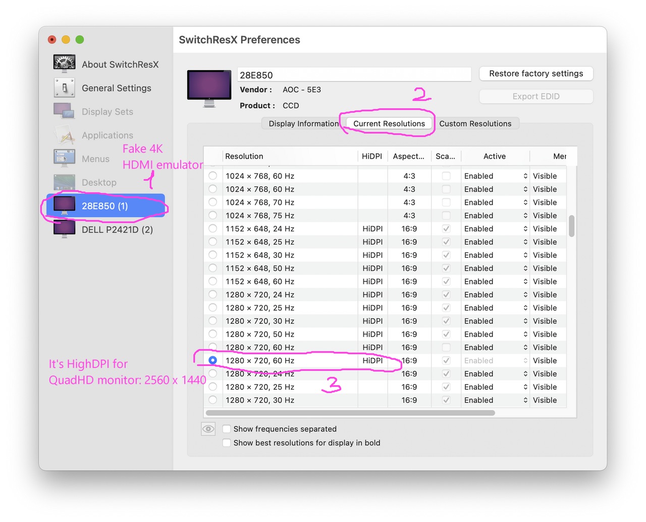 8. Howerver we need to enable 1280 x 720 (2560 x 1440 in HiDPI) which looks native for this QuadHD monitor.