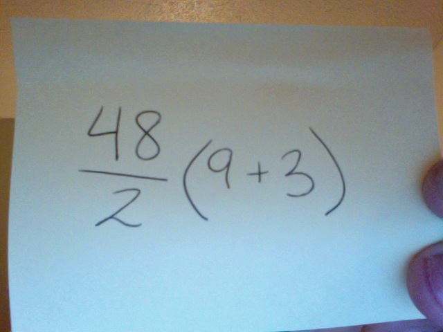 48/2(12) is something we should all be able to agree on. anything in parentheses must be evaluated before anything else.