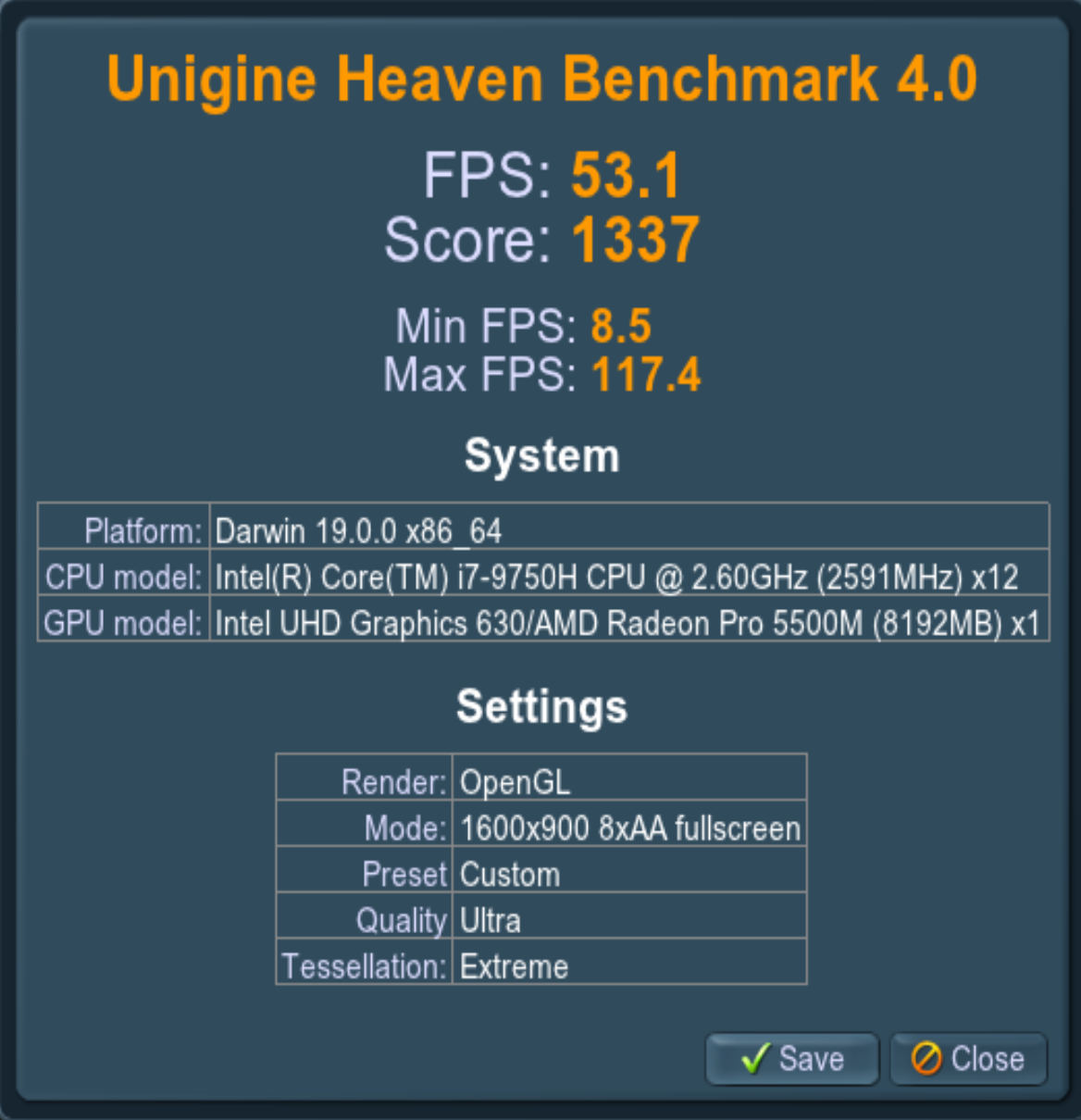 Compared to Windows machines, it's tricky, since the vast majority of what's in the Geekbench database is Macs (searching "9980HK", about 80% of the machines are running MacOS and half of the machines running a Windows OS are actually Macs running Bootcamp). I looked through all the 9980HK results in the Geekbench 5 browser in hopes of finding a reasonable sample size for some Windows machines. There are only a few actual Windows laptops running the 9980HK that show up enough to get a somewhat significant sample (even going through all 120 pages of results).