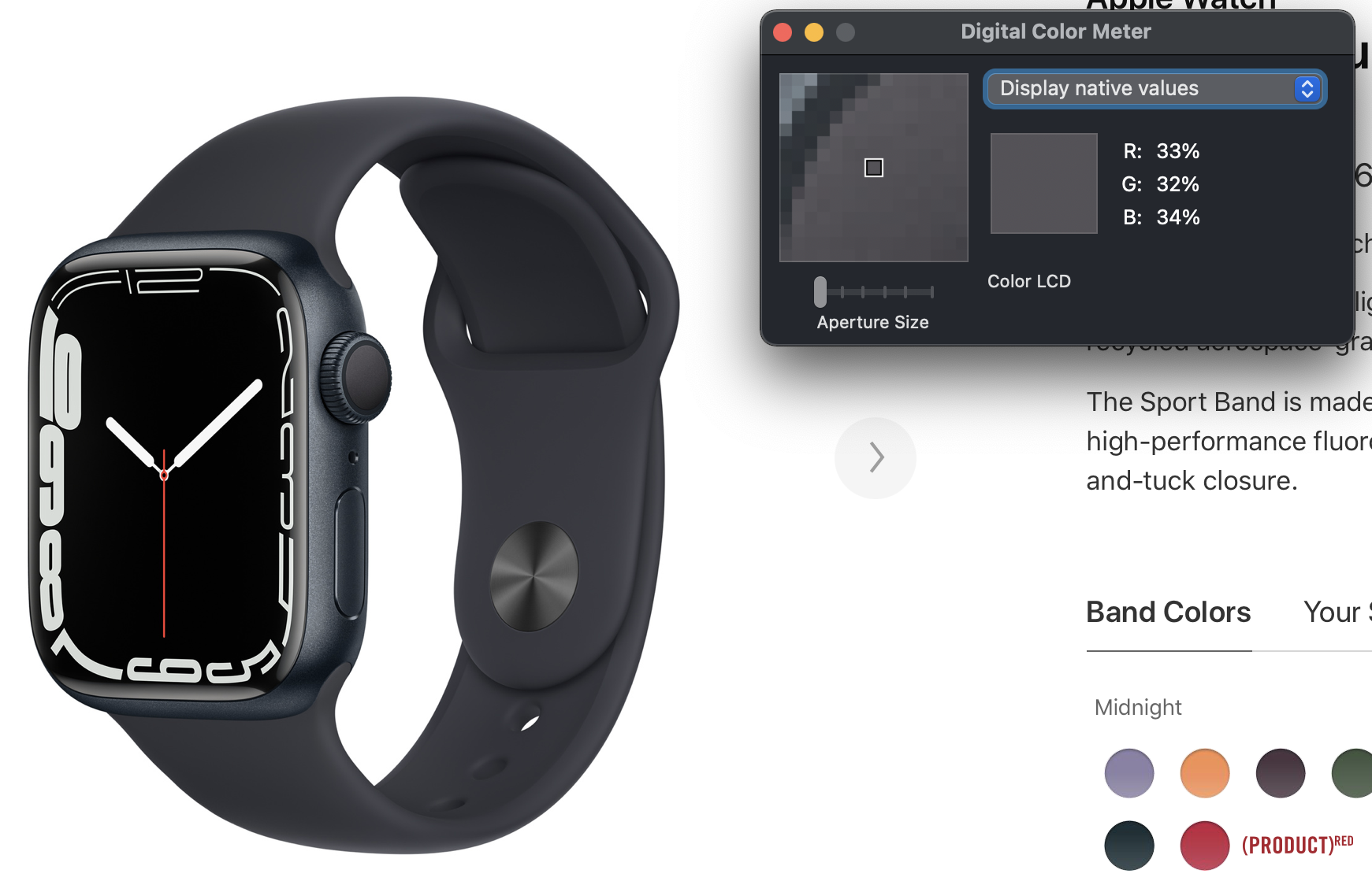 To me they all appear slightly purple, although the "midnight" band next to the "midnight" watch are obviously different hues, which is what I'm concerned about. According to the digital color meter, the band is less green than the watch, which is equal red and green which is probably why it appears more purple (more red) than the watch. I verified my nightshift is off. Maybe it's just my display, maybe the colors aren't truly equal. But maybe I can paint it a good color and find an after-market band at BestBuy in a good color for $30.