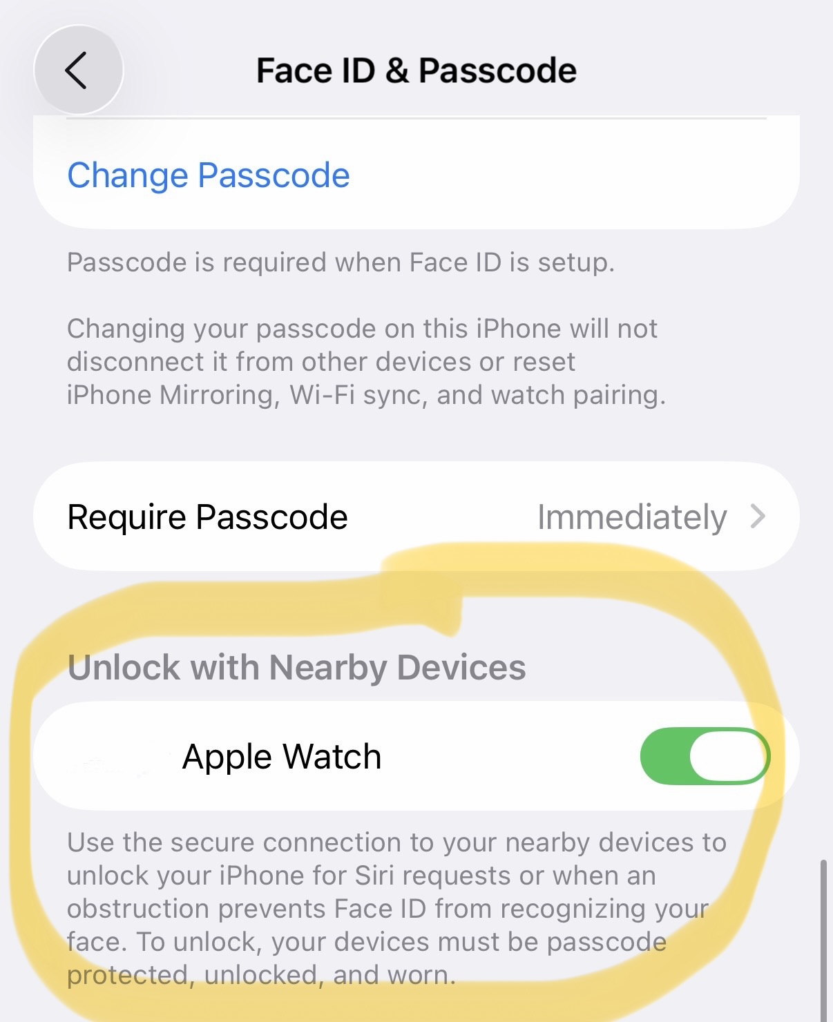 Face unlock with Apple Watch doesn’t work even though the toggle is green.