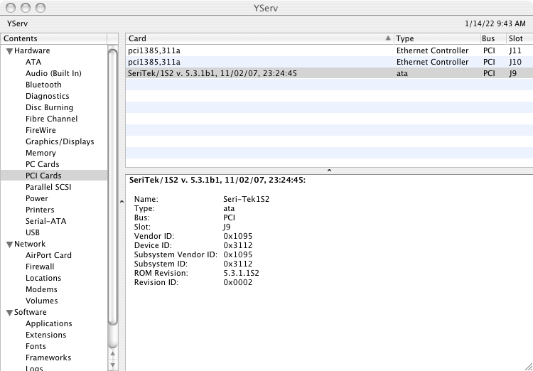I have been working on my garage for the past week and a half and am finally getting to where all the computer stuff has been dumped (boxes, cables, screws, parts, bits and pieces, etc). I will keep an eye out for the box the card was sent in (it's in one of the piles) and verify.@eyoungren: thank you, but are you sure it's Sonnet Tempo ATA card with Promise chip? ROM revision on your screenshot and all listed HW IDs match Seritek's 1S2 card. Vendor ID is Silicon Image, device ID is SIL3112. Tempo ATA fimware revisions ended with something close to 4.50 AFAIR.