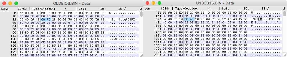 theresource=fwre_136How did you calculate 260 as the offset?The ROM image in rsrc fork of Sonnet Updater starts @offset 260 in decimal, with PCI header. 55 AA 4A - where 4A is length of the image, right? Converted to decimal and multiplied with 512 it gives image length 37888 in decimal. So image should end @offset 38148 in decimal (260 + 37888). Am I missing something here?
