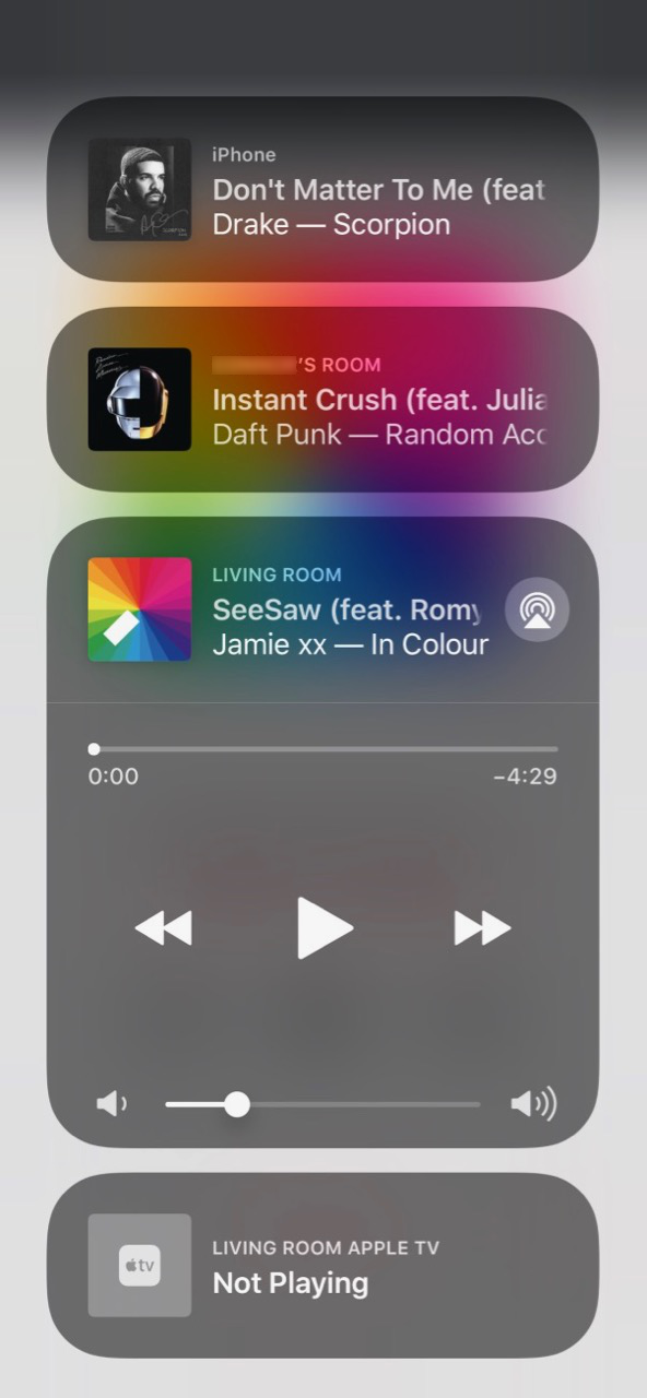 AirPlay 2 devices like HomePod and Apple TV appear as a dedicated 'card' (Apple's wording) in Control Centre: