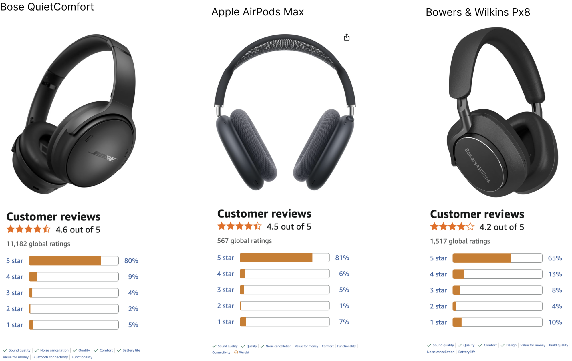 When you aggregate the feedback from 11,182 users, it stops being "entirely subjective" - it's a data-driven consensus. As you can see, the top models are consistently praised for their sound quality and overall. The PX8, in comparison, looks like the weakest performer in the group. I have owned all 3. The Px8 has the best build quality, great sound but average noise cancellation and average comfort and ergonomics.