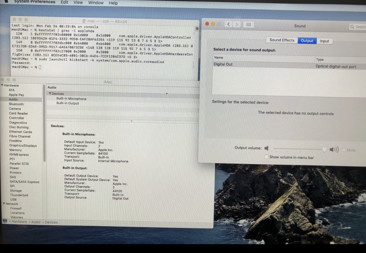 On my iMac 21.5" (2013), the sound disappeared after reinstalling macOS. After that, I tried reinstalling it again, but there was no result. macOS does not detect the audio chip, only "Digital Out," and the volume control is inactive. However, the startup chime is present when turning on the iMac, so I assume this is not a hardware issue, right? Also, when I plug in headphones, sound comes from only one side.