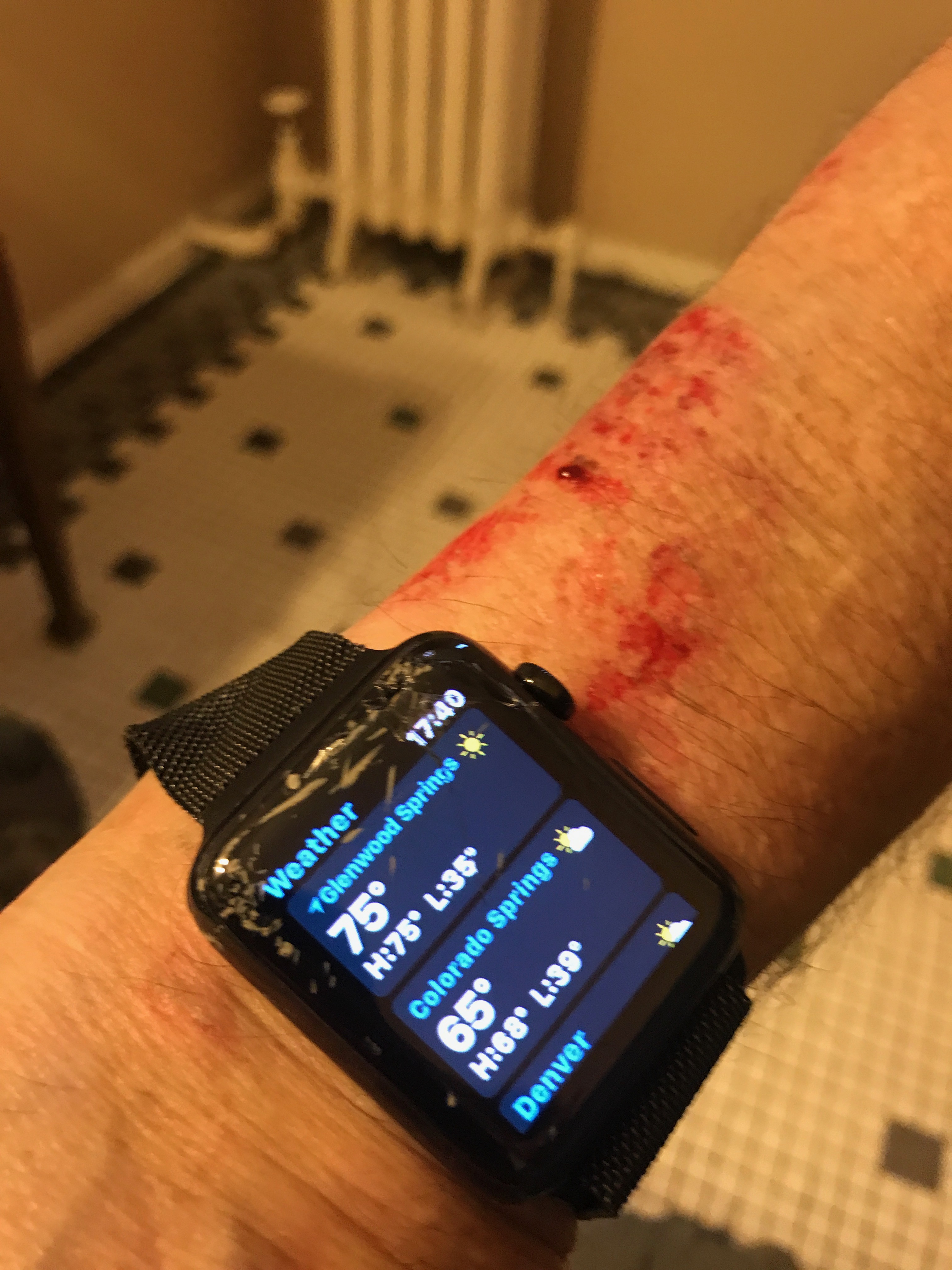 Ouch that looks nasty, hope you didn't injure yourself too much. My Stainless Steel Series 0 has scratches that just won't polish out (some have come out tho) so i was thinking of getting the Black Stainless Steel this time around, i think it looks good. I'm just not sure if i should keep my Series 0 for another year or upgrade to the Series 3 now, i don't need LTE, i do go for a run so the fitness aspect of the Apple Watch i really like, most of all it's battery improvement i'm looking for.