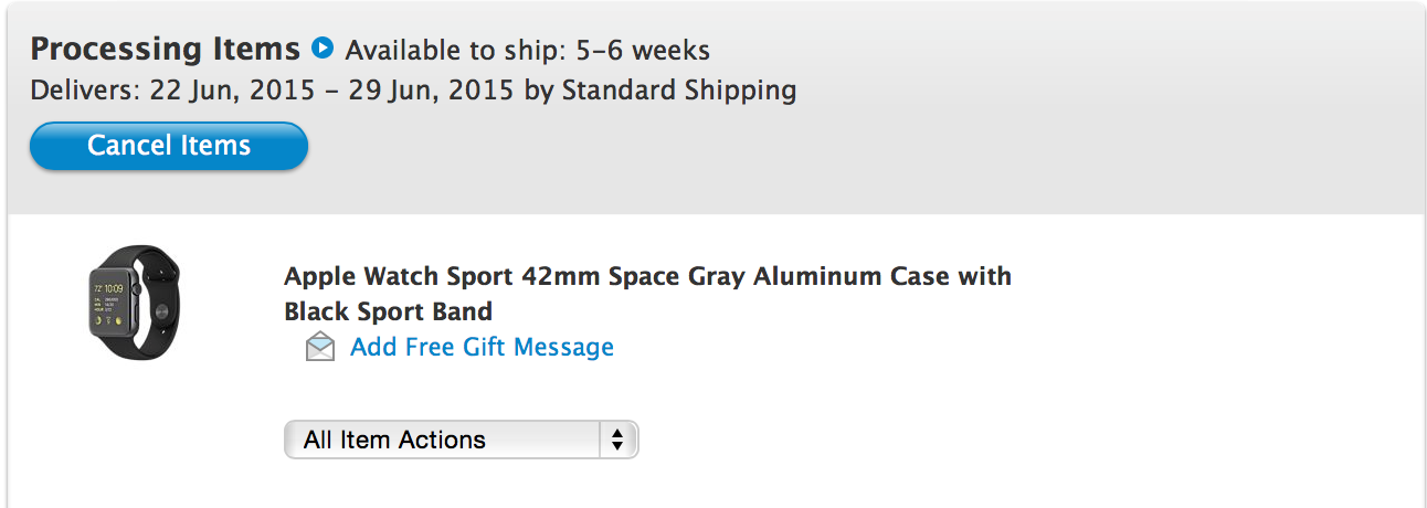 I ordered 42 SG sport at 3:53 est. Anyone care to give me a guess at what I'm still looking at as far as wait time. I would think we had made it to the ordered placed in the first hour by now. Know it's the most popular but damn.