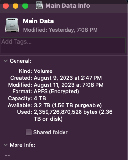 I just bough a new 4TB external NVMe SSD to use with my 4TB MacBook Pro. I had 1.7TB of available space on it and transferred 1.6TB of data from the internal one. Now I only had 100GB left on the external. I then decided to undo what I did and deleted the new 1.6TB of data from the external But after emptying the trash and rebooting, the system says I still only have 100GB left. So the system seems to think that the 1.6TB of data is still there somehow. And if I do 'Show Inspector' on all the folders in the root of the external, it only shows 2.3TB of data, which should be the correct number. Does anyone know what's going on here and how to fix it?
