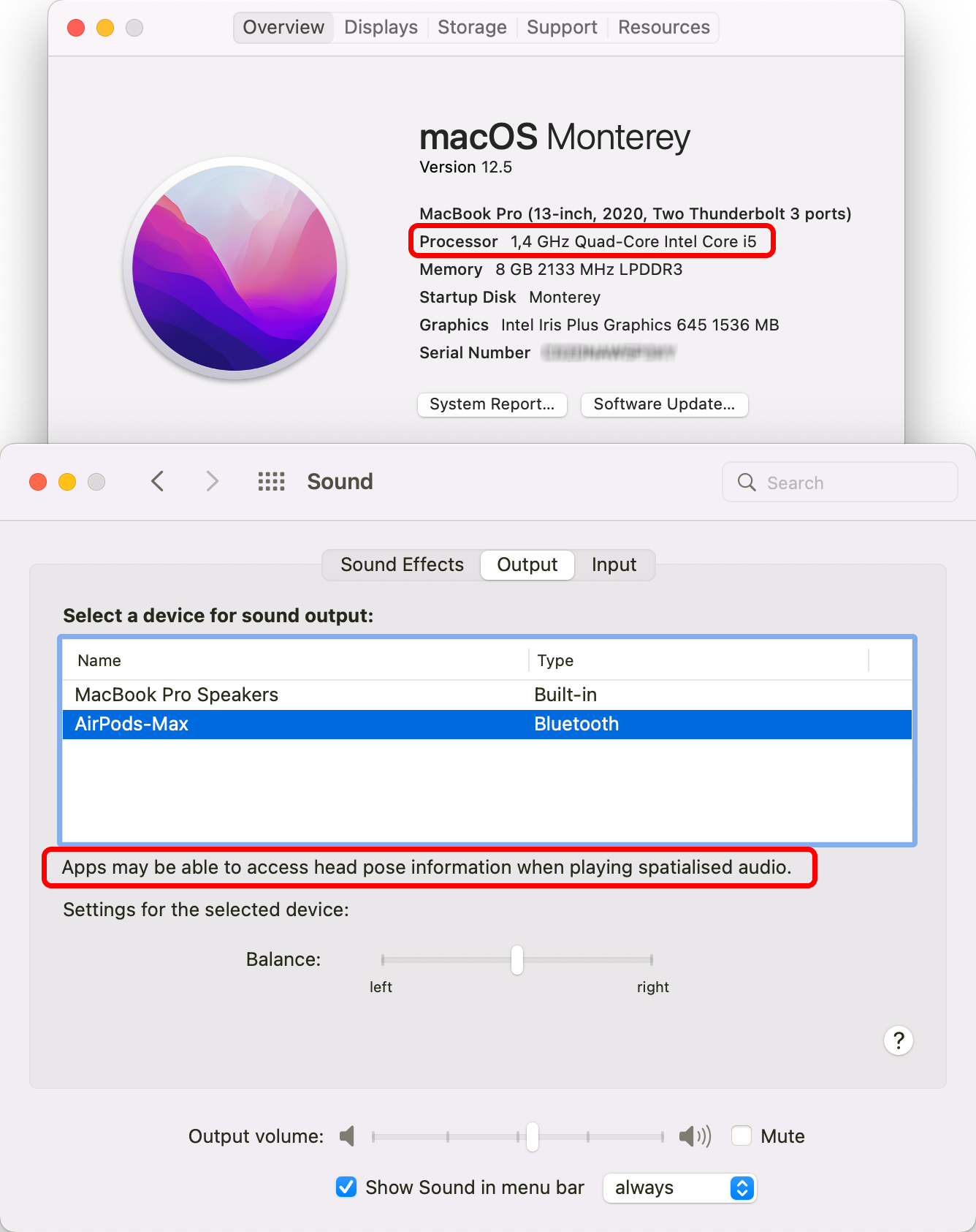 After upgrading my 2020 Intel MacBook Pro to 12.5 I noticed a reference to head tracking and spatialised audio in the sound settings.