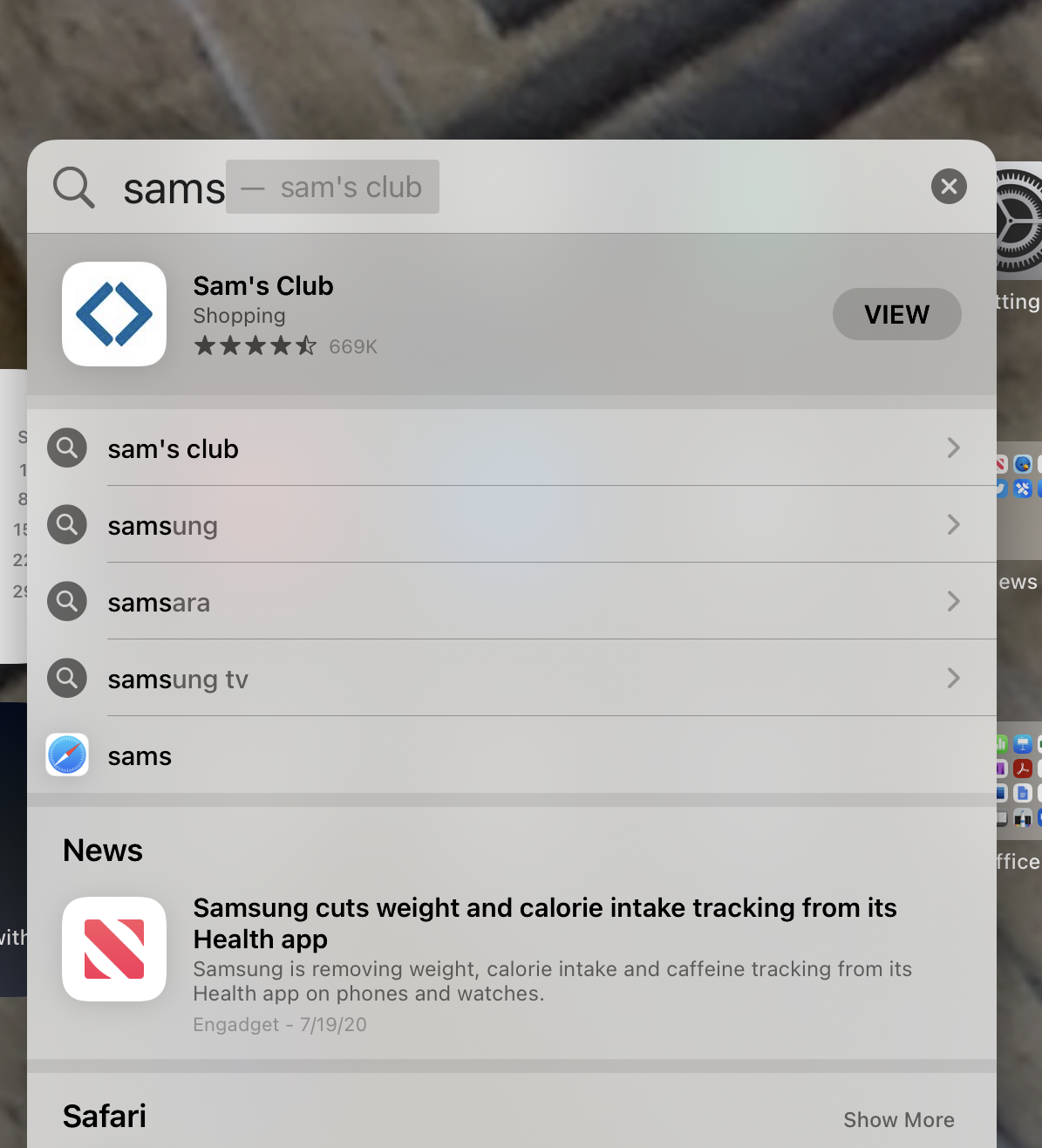 1st pic I search for sam. The app pops up. But when I type in sams then it goes away.