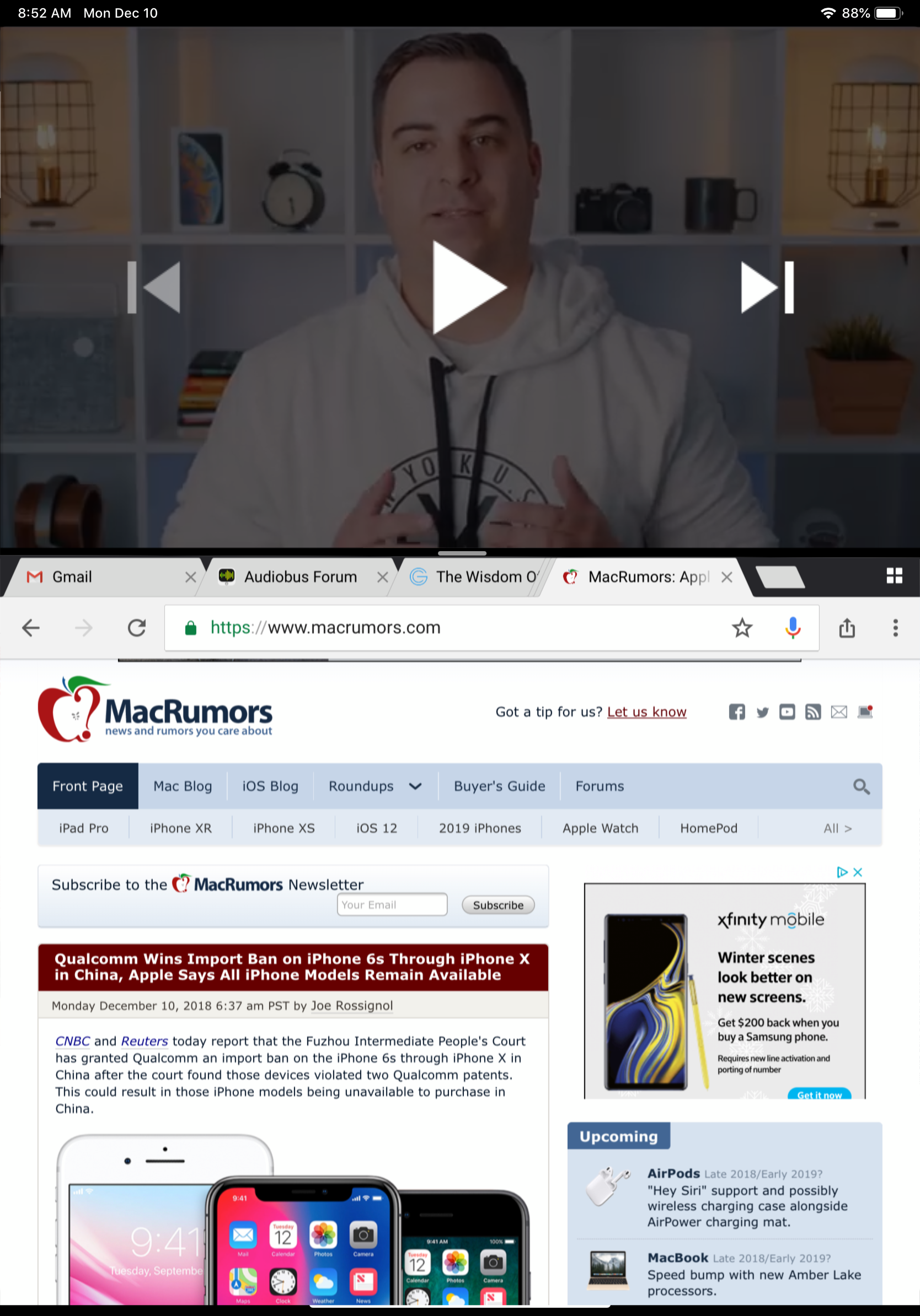 First use case: movie + website. This is possible now with picture-in-picture, but would be so much more elegant with proper top-bottom "split view." I'm just using my first awful example from above; I've resized it to a top-bottom layout. This is MacRumors YouTube channel up top and MacRumors website in Google Chrome down below.