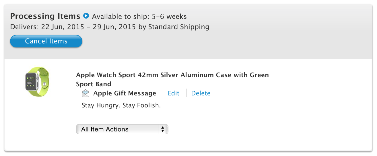 I ordered a 42mm Sport on 4/23 and it's still processing with no credit card charge. Originally set up for a June ship date and got bumped on Monday to May 14- May 20.