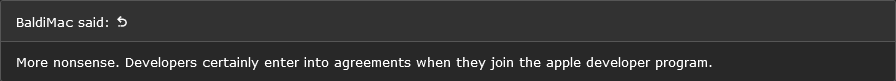 You think you can't develop apps for Mac or iOS without a developer account?More nonsense. Developers certainly enter into agreements when they join the apple developer program.