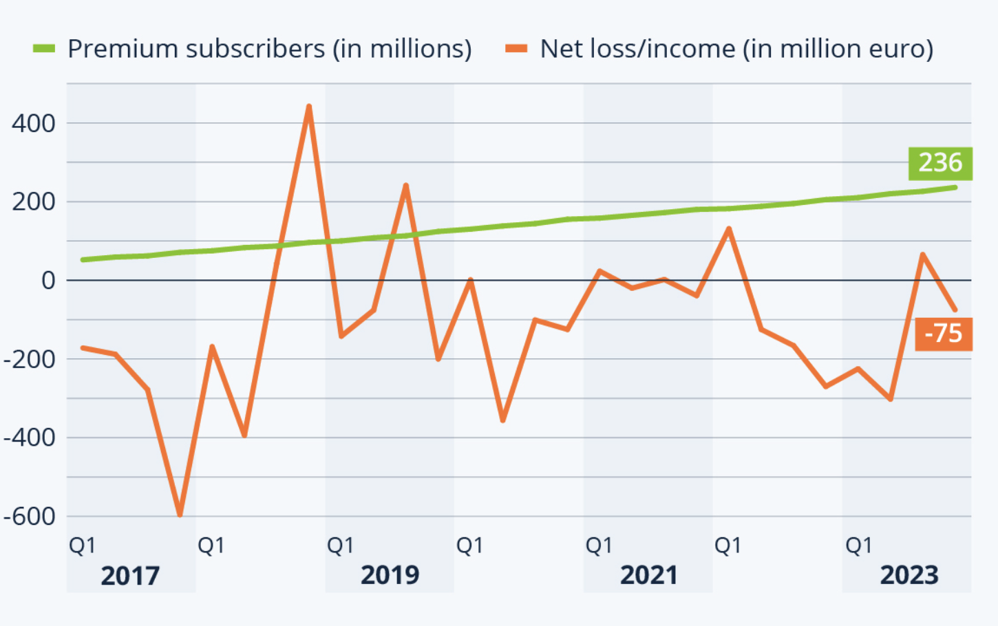 If you look at Spotify's P&L for the last few quarters, they haven't actually managed to make any money. In fact they are driving the business down the toilet pretty hard. At best they have reduced losses. This is obviously not sustainable. So the last time they reduced losses were because they increased prices, which caused further losses as people cancelled subscriptions. They drove up subscription revenue via spending on advertising. This doesn't even close the gap. Here's the plot from Statista