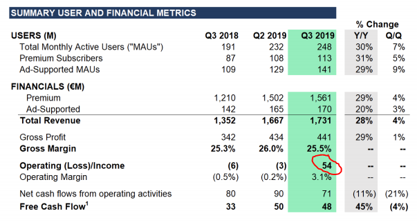 However, Spotify anticipates returning to a loss for Q4 2019, estimating that its operating loss will fall somewhere between €31 million and €131 million ($34 million – $145 million).