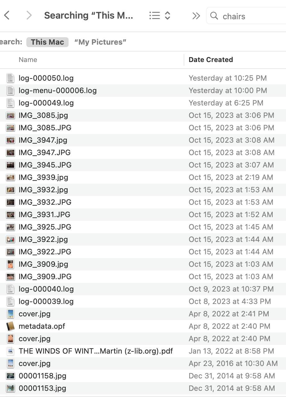 In the search results, images all have chairs in the picture, but I have Images turned off in settings. It also shows extraneous files like log files that do have chairs in them. I do not want to search these bizarro files, but don't see a way to exclude them. Also, I cannot update to Sonoma as my machine won't run it.