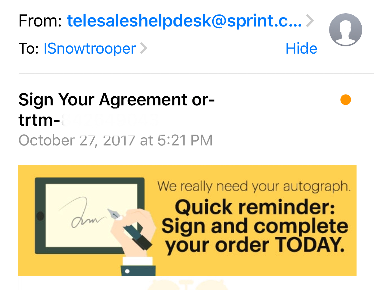 My contact called about 45 minutes later, and we were both seeing through every metric available to us that the order was OK. While on the phone with him, the mrs said she got a voicemail from Sprint (around the same time I was talking to telesales/1st lvl CSR's-prolly right after they hung up on me) saying “Your order had canceled itself, please call when you are available to re-enter order”,