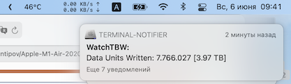 two applets in Automator, based on smartctl, to monitor the TBW consumption on my M1 Air. One for quick monitoring from dock, the other starts or stops the service in the background, which periodically displays messages about the current TBW level, and should alert if it gets too high. It also keeps a consumption log, which can be viewed by the first appt, or after stopping the service on the desktop. It monitors every half hour. The logic is not perfect, but it works. For the first run, you have to type