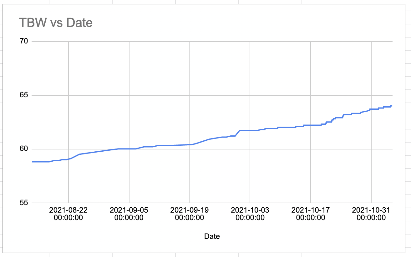 OK, so this is my record below, (initially manual recording now a silly little script run off a cron job each hour), of TBW on my MBA 256/8. Reports 64TBW as of today and it goes through about 60Gb/day on average. Still seems a bit much but nowhere near that figure you quote but far higher than others have quoted!My M1 8GB/256GB MacBook Pro has written over 800TB!! to disc in 11 months and Smart data showing 29% SSD life left. Currently at Apple Store.