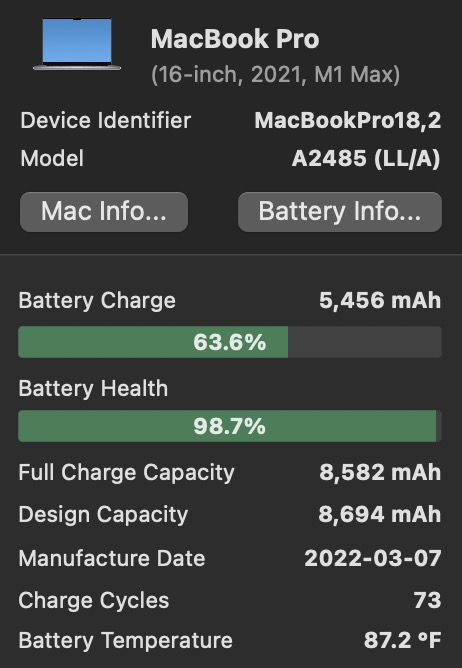 Could be that without alDente your bat heath would be something devastating like 93%.Yep, 99.99% of the use is clamshell mode with an Apple studio display. I use it all day and all evening. But it spends its entire life plugged in. Maybe 3 to 4 times a year I end up using it on battery when I go on work trips or personal trips. AlDente has done wonders for it.