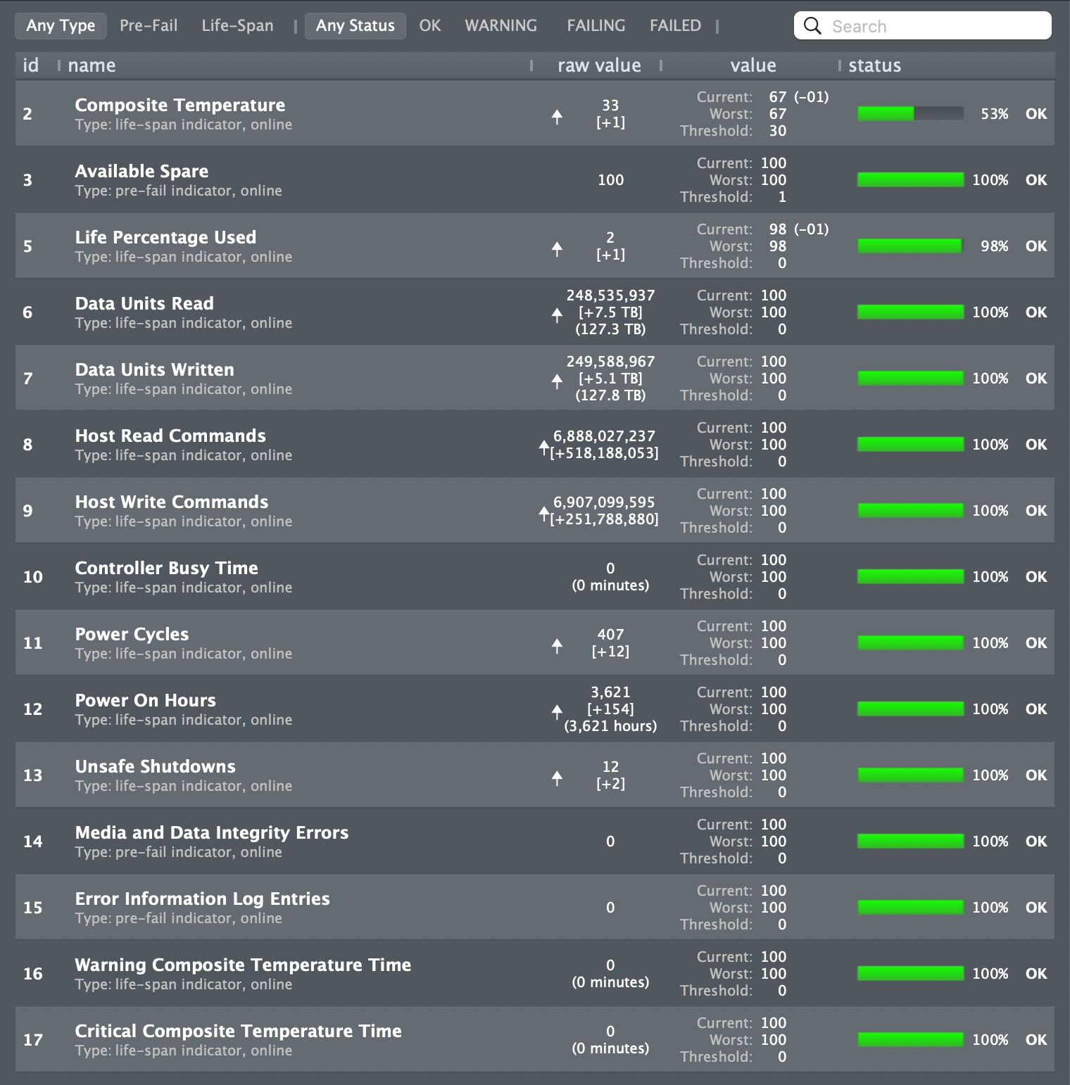 Click on the attribute name for more information:The "power on hours" can't be correct. This Mac is running almost the whole day since six months.