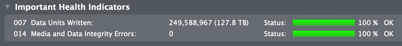 Estimating one-percent per 100 TBW, you’ll have worn the drive to 50% after 5 PBW (that’s five petabytes written). If we quarter that (i.e., divide by four), that’s 50% at 1.25 PBW. I seriously doubt the vast majority of users have a drive write a petabyte of data in the system’s realistically usable lifespan, or even get close.