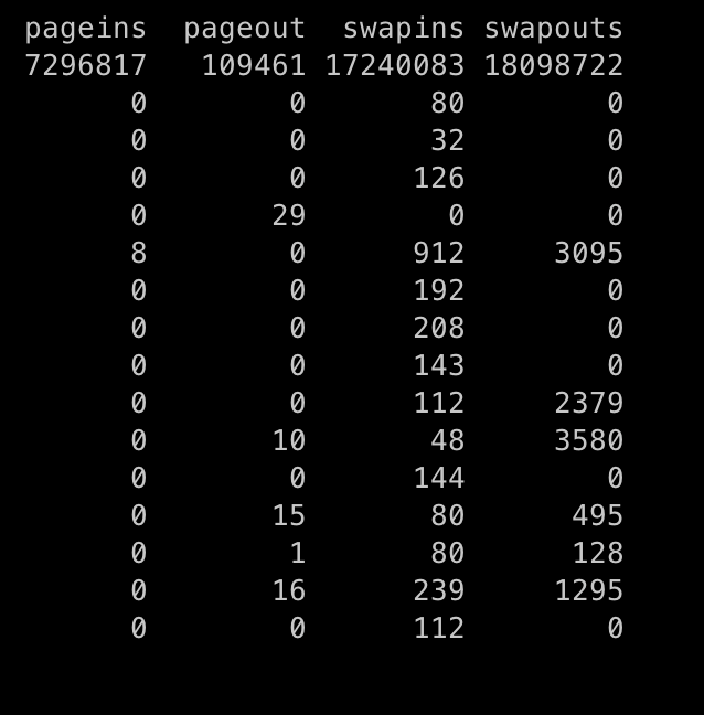 - vm_stat reported 17+M pages 16K each swapped in (written to swap file) which gives you roughly 270+Gb