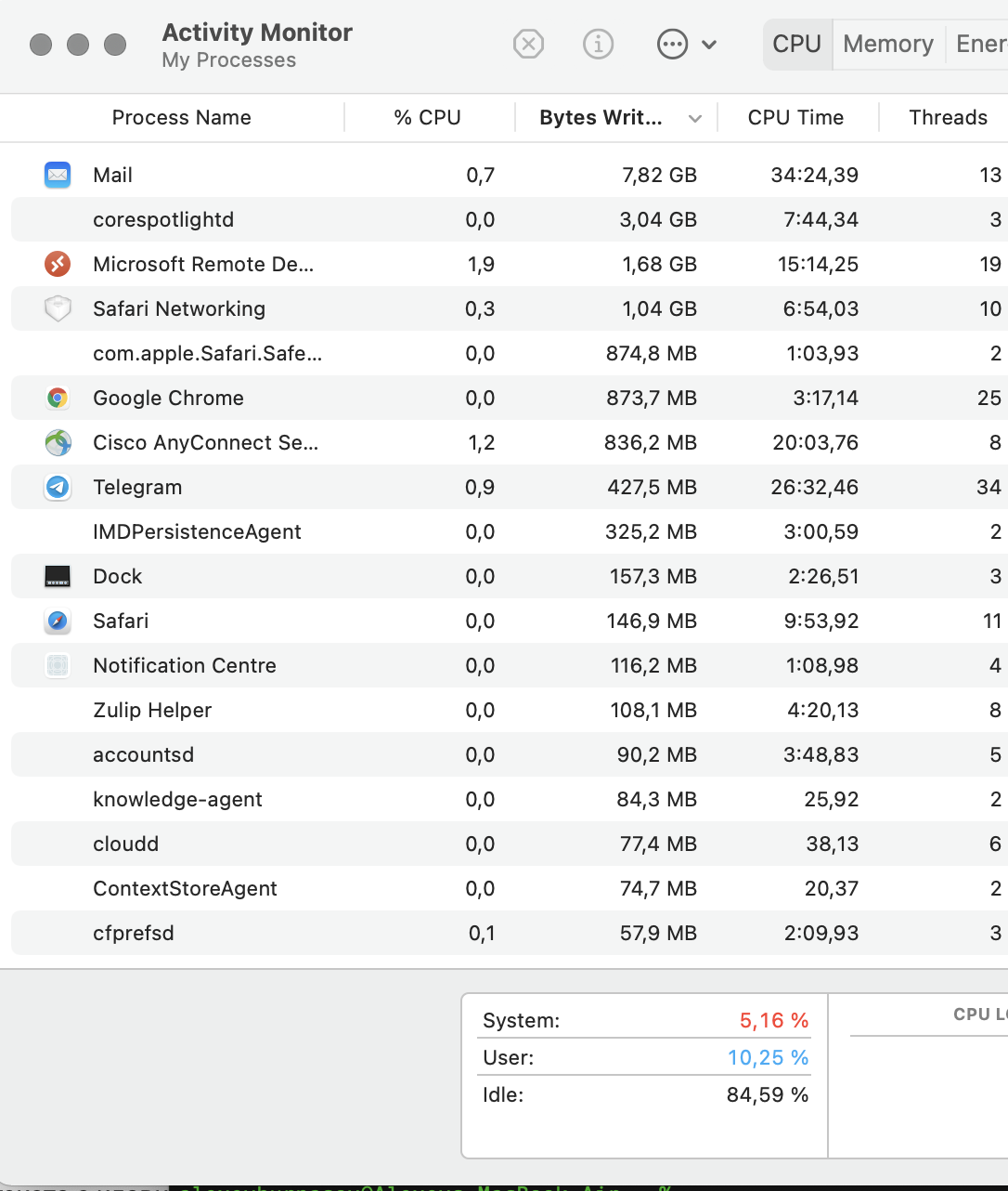 Since the last reboot a few days ago 7.37TB have written to disk. In particular, kernel_task has written 5.17TB and the Nextcloud client 1.38TB. I will check with the Nextcloud communities what the client is doing on the main drive because its data folder is on an external drive. Unbelievable.