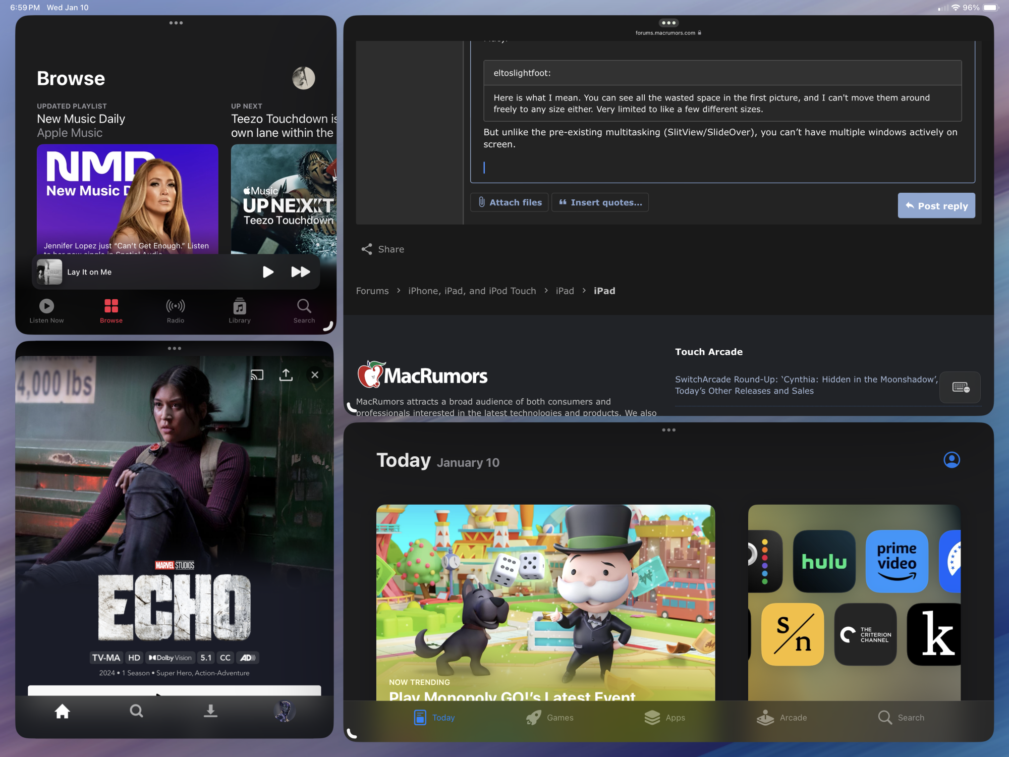 If you look at other offerings there is the Android tablets where you can see the rather sad state with the recent Pixel tablet reviews, a dock and split screen view is all there is for multitasking. The one system that would allow for great multitasking is Windows but the only direct iPad competition is Microsoft Surface Go tablets that to this day have lackluster hardware. They run the full desktop Windows 11 Pro which I'd prefer over the very restricted iPadOS. But they also use traditional Intel hardware instead of ARM so the performance is bad even on the most expensive versions.