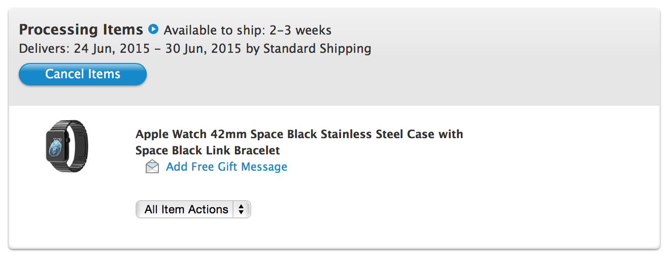 I felt like there should be at least a shipment once a week, if they don't I am very disappointed in Apple. If they are not sending out at least one big shipment a week, what the hell are they doing? The stainless steel link bracelet is caught up to almost May now. I'm sorry but there is no way its that difficult for them to put DLC on the watch. I know the link bracelet takes 9 hours to make, I don't think that could be the problem at this point. If they can be caught up enough to start shipping them to stores in 2 weeks, it seems that they should take some of the lines down and produce our watches first. I'm very frustrated they have caught up on every single watch but ours, and we spent the most on ours. It's hard to see watches slip to July on all 42's and they catch up to 2-3 weeks in a matter of days. I feel like they are not trying as hard as they say they are to finish our watches.
