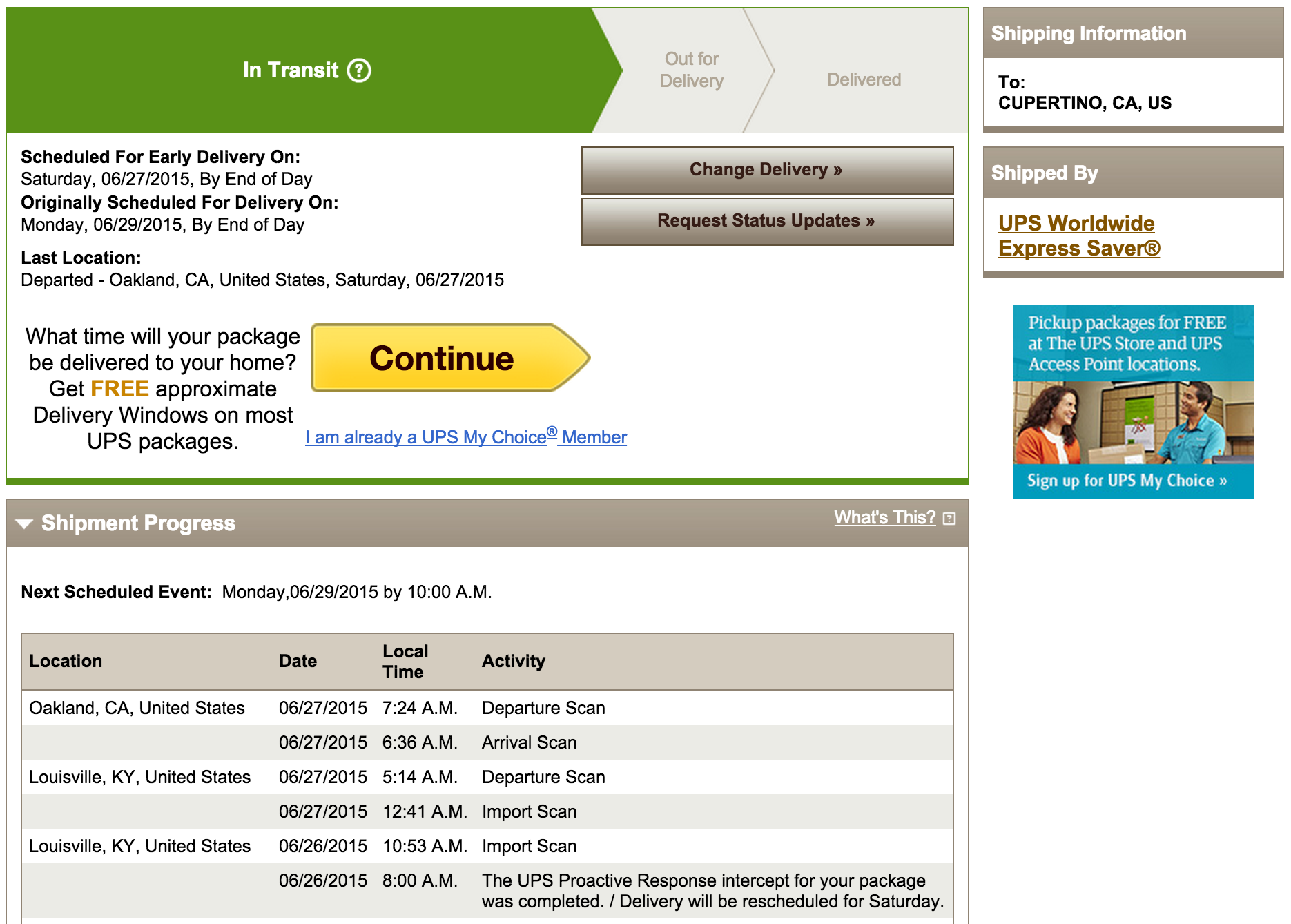 This was more than a little upsetting, considering we have a desk in the front where they could have delivered it. So I call UPS and when I gave them the tracking number, she asked "Is this an Apple Watch?". She then rescheduled the driver to come again today! I was very nice and polite, and just simply asked if they could re-deliver it today but to our front desk. She gave me a 1PM time estimate!