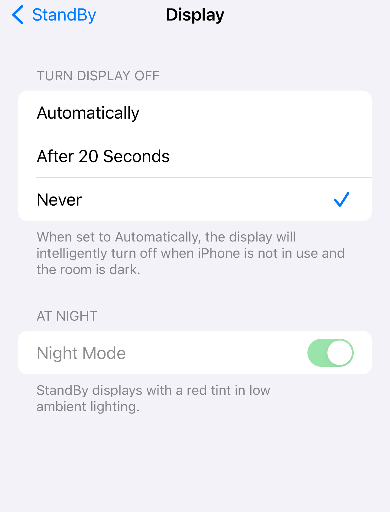 Not for me. iPhone 15 Pro Max running iOS 17.3This was fixed a long time ago. I had the same issue of standby not staying on and the menus were initially poorly implemented. Once they updated ive had no issues with the standby mode. Screen stays on all night.