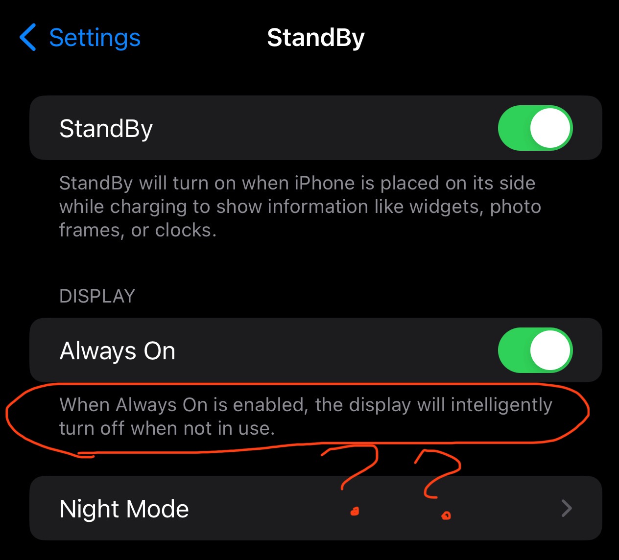 Apple phone support had me turn off Standby and Motion to Wake, do a hard reset, then turn Standby on again while leaving Motion to Wake off. Now it almost works correctly. My phone enters Standby, dims to red, and then turns off. Touching the screen turns the display back on again in dim red, and it stays on all night.