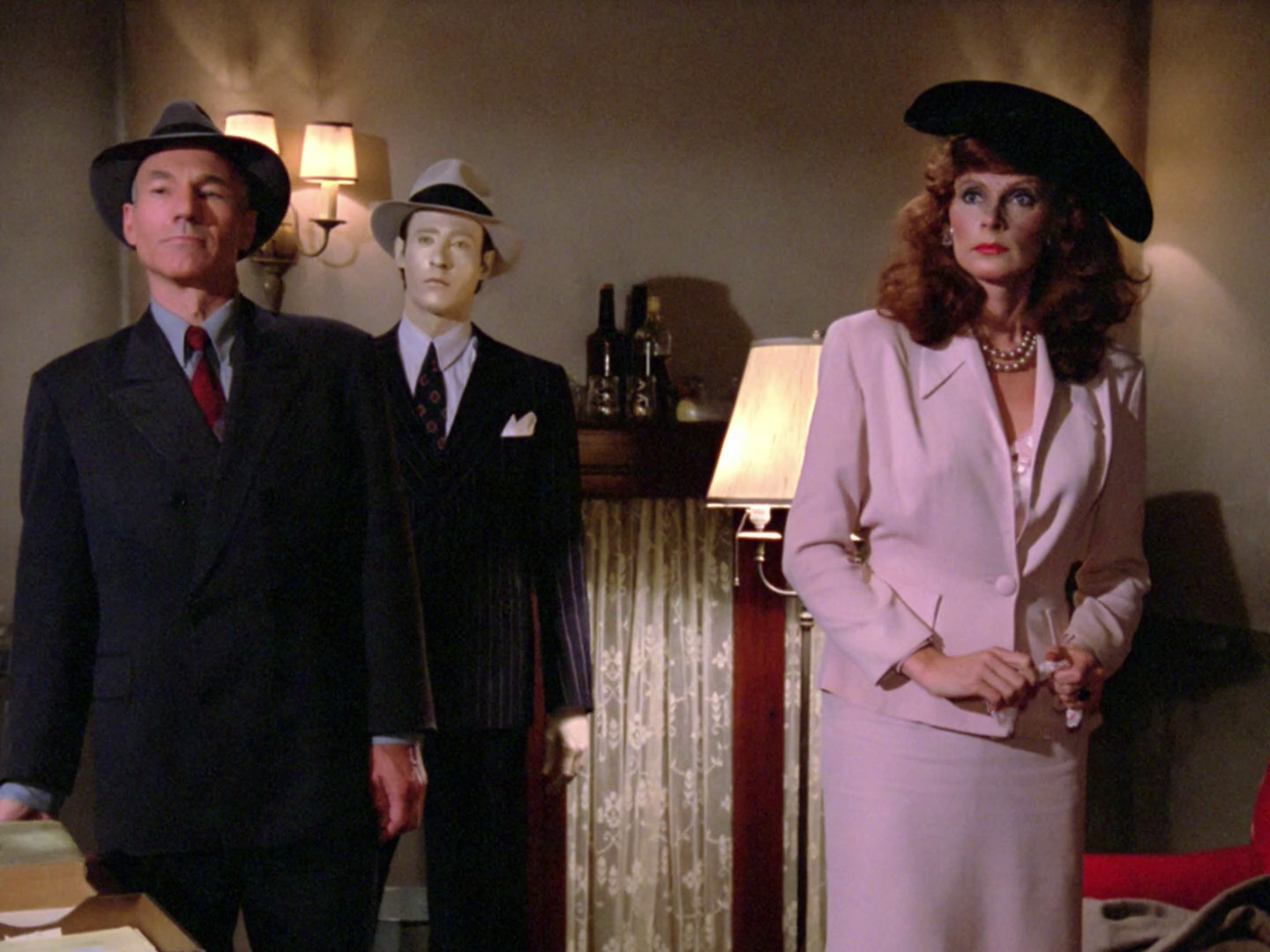 Picard is frazzled trying to learn a difficult greeting to open a relationship with an insect species, the Jarada. Troy suggests he takes break in the Holodeck. Accompanied by Crusher, Data, and a 20th Century expert Weyland, Picard assumes the persona of Dixon Hill Private Eye, San Francisco, 1941.![]()