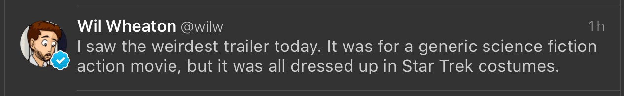 I saw the first one again just last night. And I did like Into Darkness. To hell what Wil Weaton thinks. Rather watch a generic science fiction action movie all dressed up in Star Trek costumes than watch several generic, BLAND, science fiction TV shows all dressed up in Star Trek costumes where Trekkers are bigger dorks than Star Wars nerds.