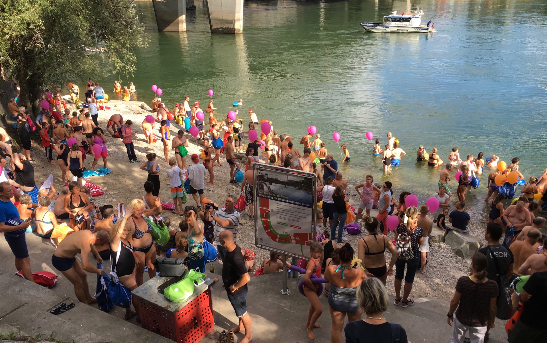 My 6S isn't waterproof. I took one from one of the start points and one as I was walking to it (before the river got really full of people), but for the rest you'll need to google "Rheinschwimm 2018". This years is on Tuesday. Looking forward to it!