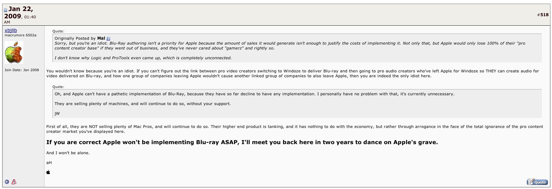 Why do you think people are anti-Apple for wanting Macs to have better features than they currently do now? Features that are common offerings from Apple's competition? Is the only way to be "pro-Apple" to blindly accept everything Apple does as being flawless and never saying anything critical about the company or it's products?Seriously, I have no idea why anti Apple people are here trying to make Apple folks think Windows must be better because it supports BD.