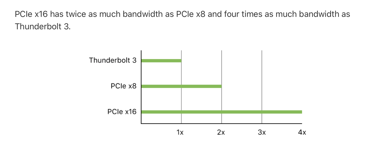 On the Mini, I'm driving a single (almost identical, from what I understand) LG UltraFine 5K monitor with a Radeon Pro 5700 XT with 16GB of GDDR6 memory inside a Razor Core X over TB3. Let's assume the most current version of Catalina or Big Sur fully and robustly supports eGPUs. I'm editing (RAW photos and videos); I'm rendering them.
