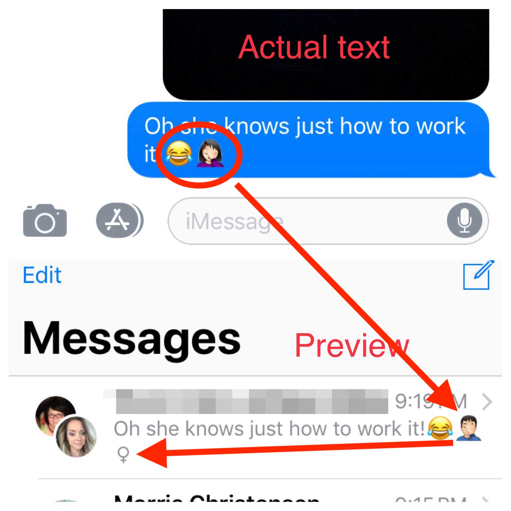 My daughter sent me this screen shot. She's running 11.1.2 on her iPhone 7+. She was texting with her sisters in a group chat and used the female "facepalm" emoji in a text message. When she looks at that message in the Messages preview, is show the MALE "facepalm" emoji followed by the "female" symbol.
