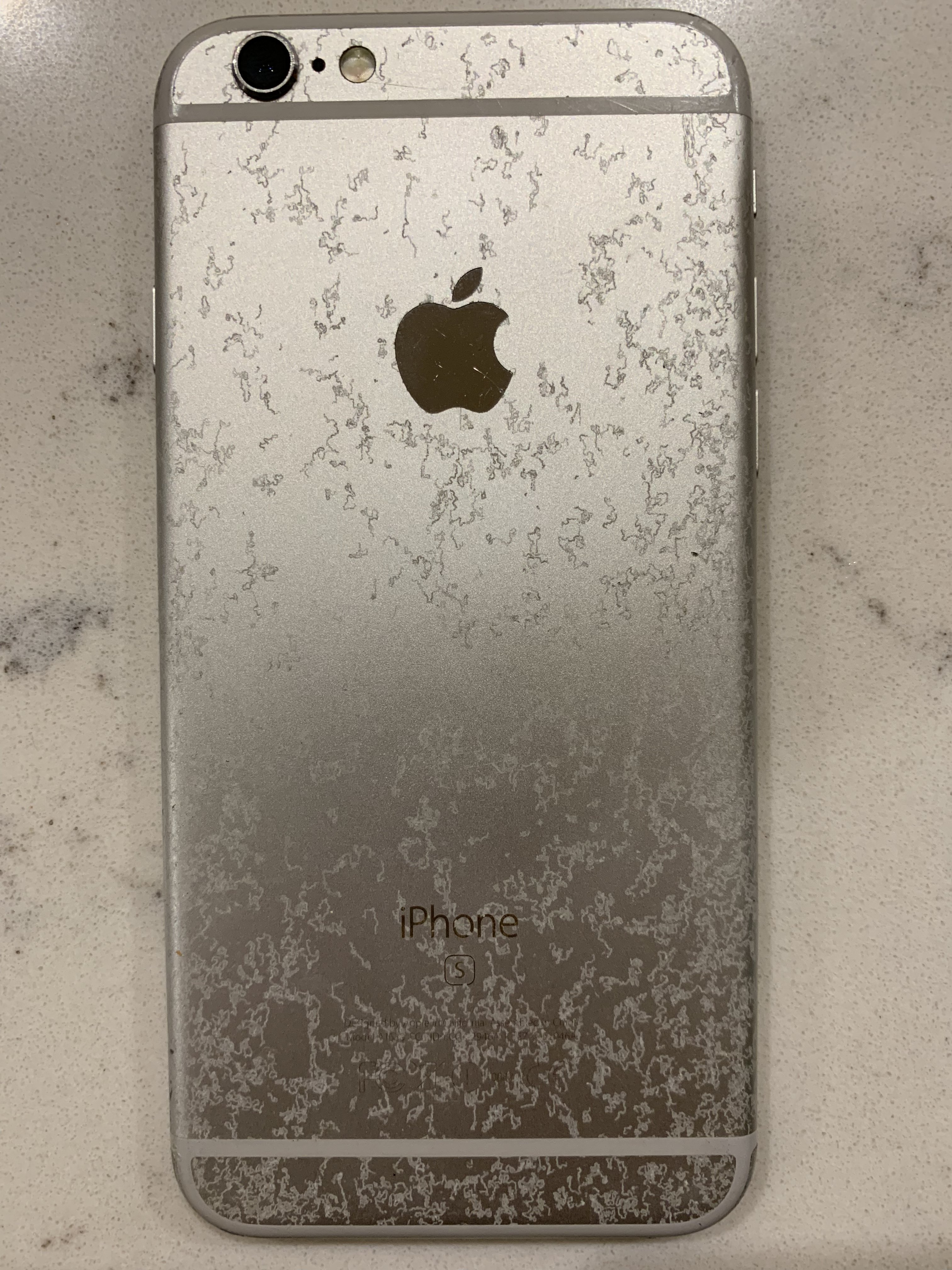 There have been threads showing this before. I still think it looks like some kind of fungus or biological eating the anodized finish where the phone was laser etched. I have seen similar in old Leica lenses that had moisture damage. The fungus was eating the surface of the glass coating.