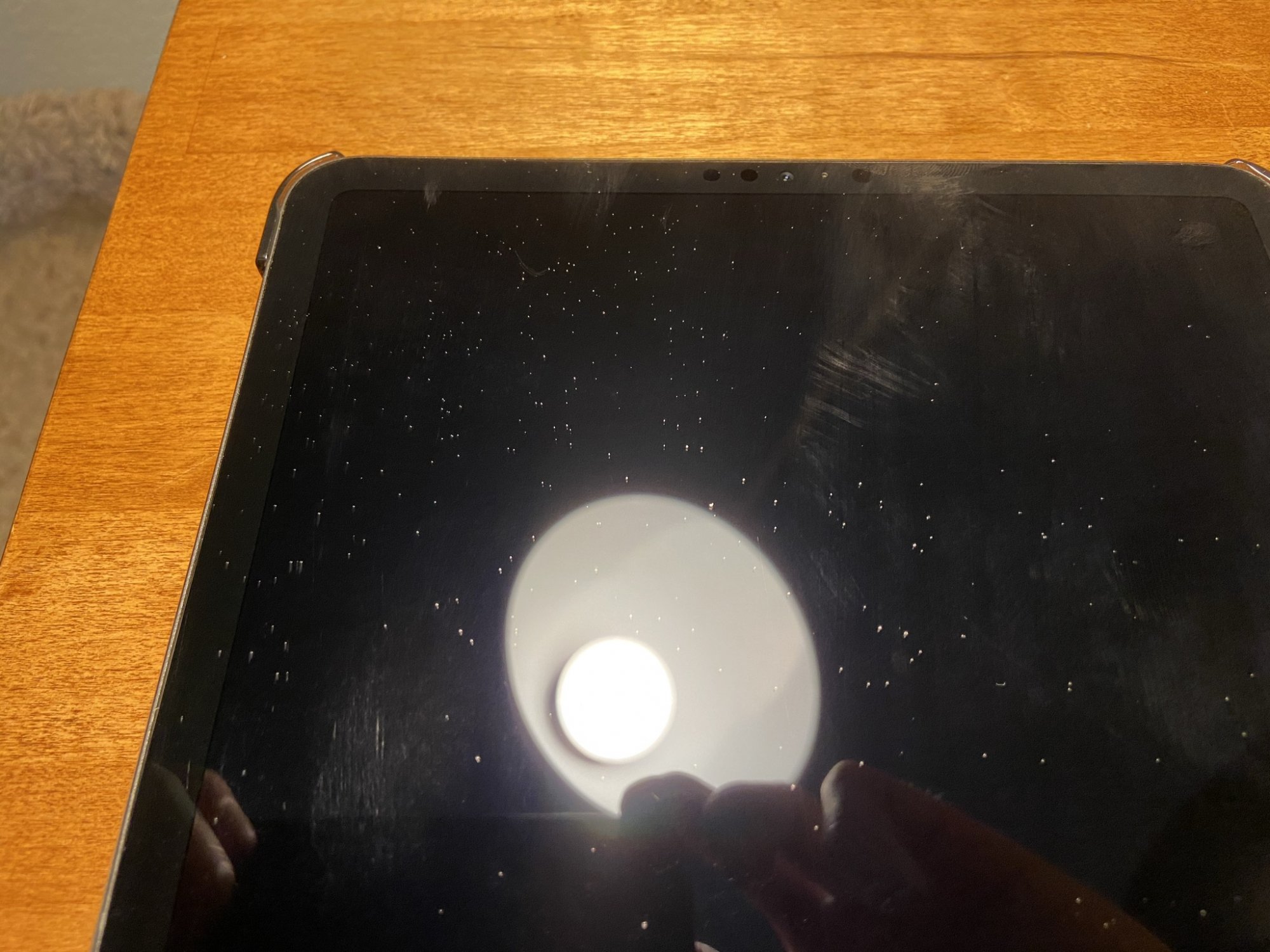 Hey everyone, it had been a while since I last used my iPad, and I noticed some small specks scattered across the screen. First thought was it was just dirty so used a micro fiber cloth and tried wiping it off but nope, it didn't work. Added little bit of water and still won't budge. So I thought maybe they were scratches, or damage to some part of the screen, which doesn't seem to be the case. If I very gently use my finger nail and run over the speck back and fourth, I can get the speck to move. So I can move these specks across the screen (though it does require a lot of effort and risk of scratching the screen). I have no idea what these are. They are solid and granular, almost like salt or sand or something but again, they do not come off the screen easily at all. I've also tried using compressed air, and a nylon brush that you would use for cameras, with no luck. Even using the apple pencil, I can't really get them to budge. Any idea where these specks may have come from? I've basically tried everything I can to clean this screen, and anything else I am honestly afraid would damage the screen. Is this something that Apple could help with in terms of professionally cleaning/removing this debris? Could this be a defect with the screen itself?