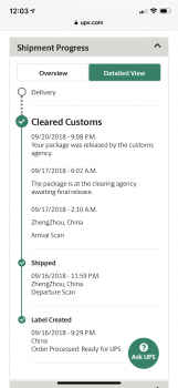 09/18/2018 12:25 A.M. A UPS My Choice® delivery change was requested for this package. / The receiver will pick up the package at a UPS facility.
