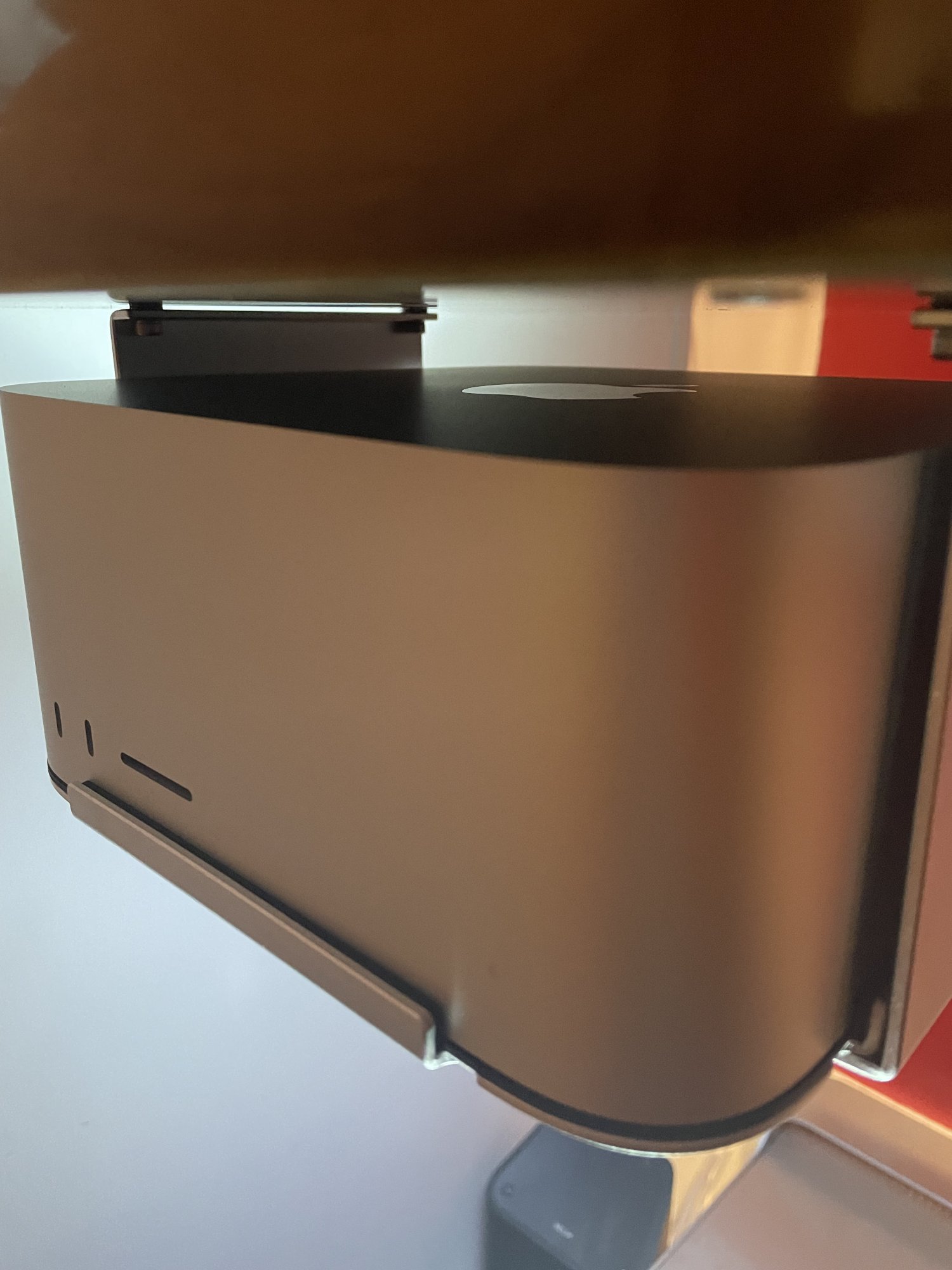 I was using the double height NewerTech acrylic mount early on but as the base is sized too small for the Studio I raised the Studio with foam to provide clearance for air flow and that made it difficult to remove the Studio for cleaning so I switched to the Sengtek. It is definitely the best mount I've seen for a Studio so far.Better still, a plastic under desk mount would let signals pass readily.