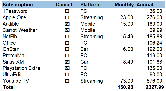 I'm paying over 2k annually for various subscription services. Given inflation, and how nearly every streaming service has increased their price (sony by a lot). I'm looking to cut back. I really don't need carrot, playstation, etc.