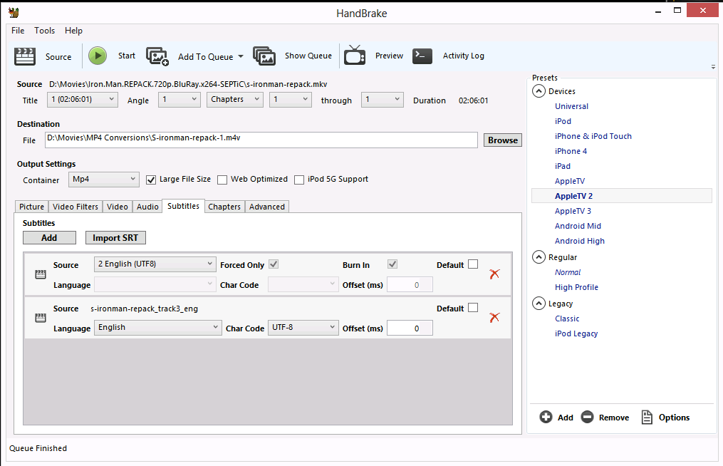 When I use this as my source in Handbrake, it doesnt show any subtitles in the "subtitle" tab.