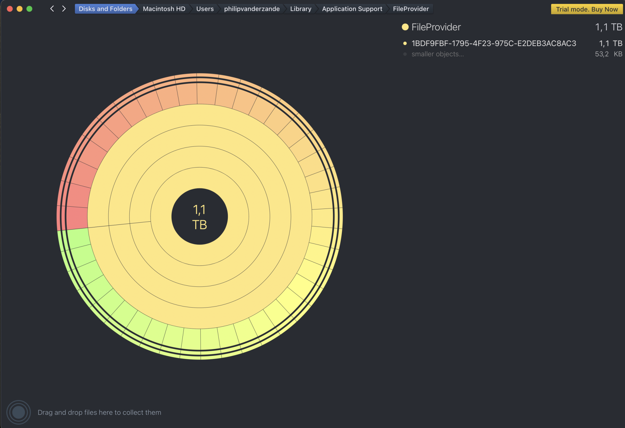 When looking at the different data categories on my hard drive, the Applications category shows 1.14Tb of used space, whereas I have less than 50Gb of application on my drive. All other data categories look comparable to last week.