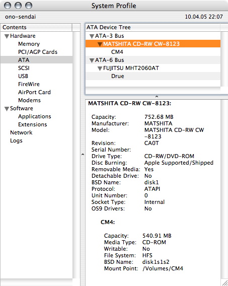 B Blue Velvet Moderator emeritus Jul 4, 2004 21,929 265 Apr 10, 2005 #3 senorgorra said: I looked through Apple system profiler, but no luck. Click to expand... Weird. What does it say? You are using OS 10.3? e.g. Apple system profiler says on my G4: PIONEER DVD-RW DVR-105