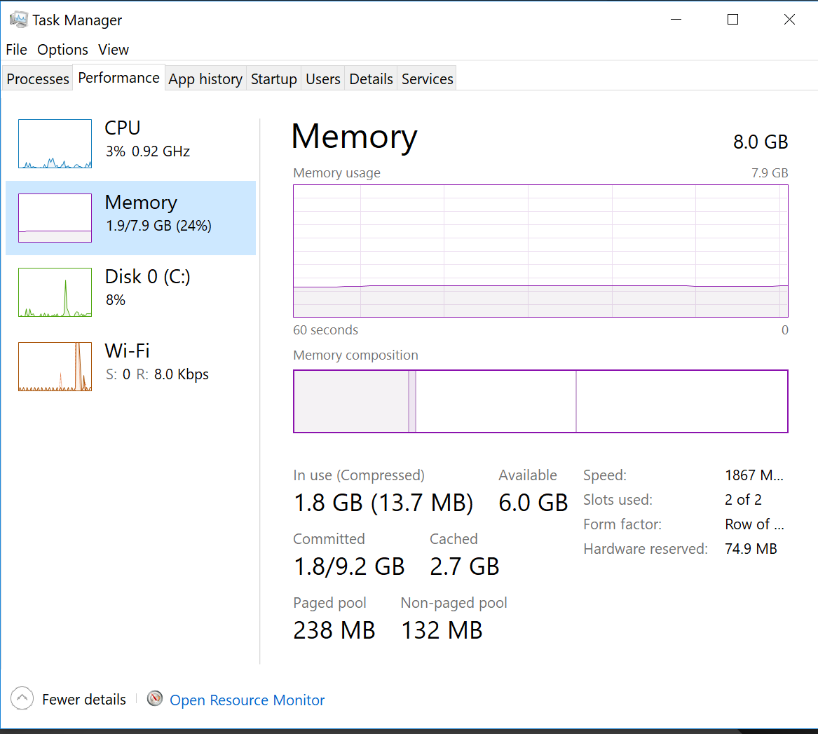 Surface Book fully up looking at 138 processes (security & VPN up), RAM utilisation around 2.3Gb. There's is a distinct difference in how Windows 10 & OS X manage memory, neither theses days to me is terribly bad, equally dependant usage one may fair better.