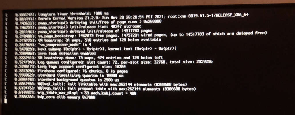 Without kprintf output enabled in the boot-args, no serial port output would occur and the graphical console would continue from the point you see above to show console messages until macOS boots.